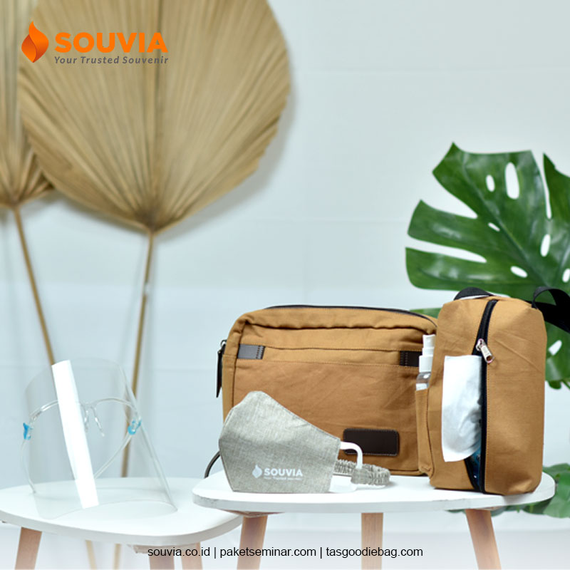 Souvenir untuk perpisahan teman kantor satu ini menggambarkan perhatian kamu kepada kesehatan bestie kamu. Dengan souvenir ini, kamu bisa memberikan perlengkapan new normal dan juga tasnya.