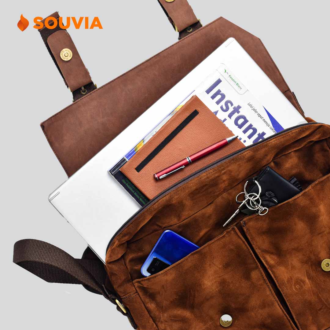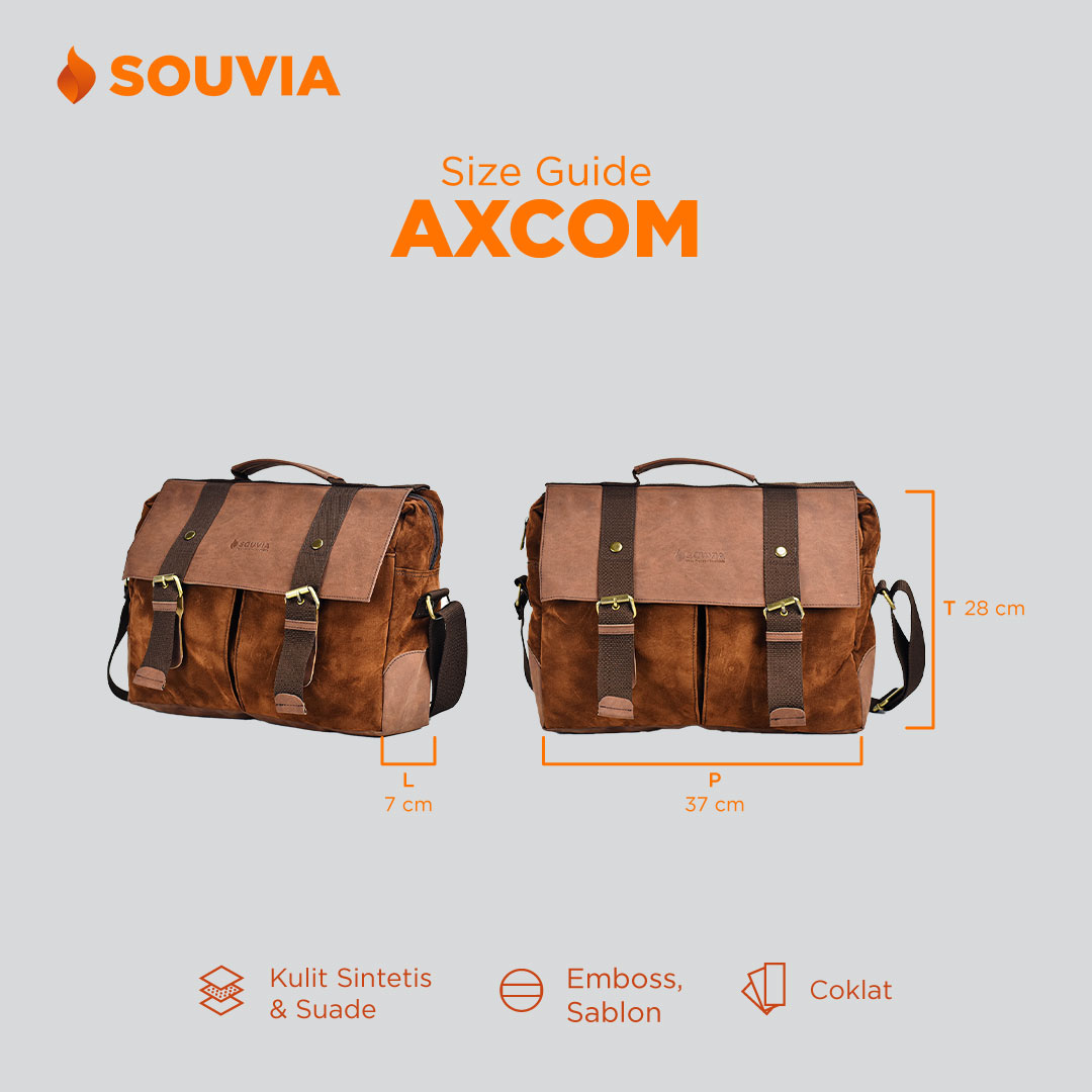Tas Axcom adalah tas selempang custom dengan desain elegan yang memadukan material suede dan kulit sintetis (dapat request kulit asli). Tas ini dilengkapi 1 kompartemen utama beresleting dengan ruang laptop hingga 14 inch, serta 2 kompartemen tambahan untuk menyimpan charger, dokumen, maupun perlengkapan kerja lainnya. Dengan berat 560 gram dan dimensi 37 × 7 × 28 cm, Tas Axcom tetap terasa kokoh namun nyaman digunakan.