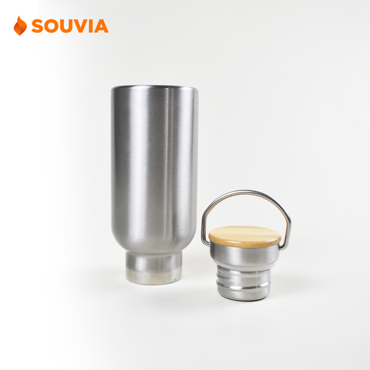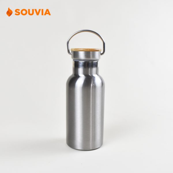 Tumbler botol minum bahan stainless steel yang dipadukan dengan tutup kayu asli dan terdapat handle dibagian penutupnya